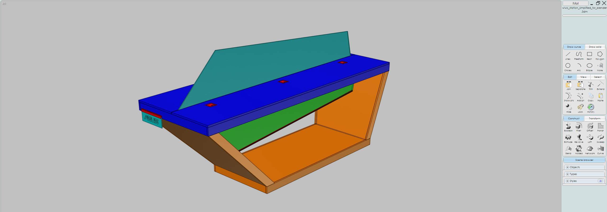 The concept was modelled in Blender. While solid based modelling may often be the standard for that kind of task,