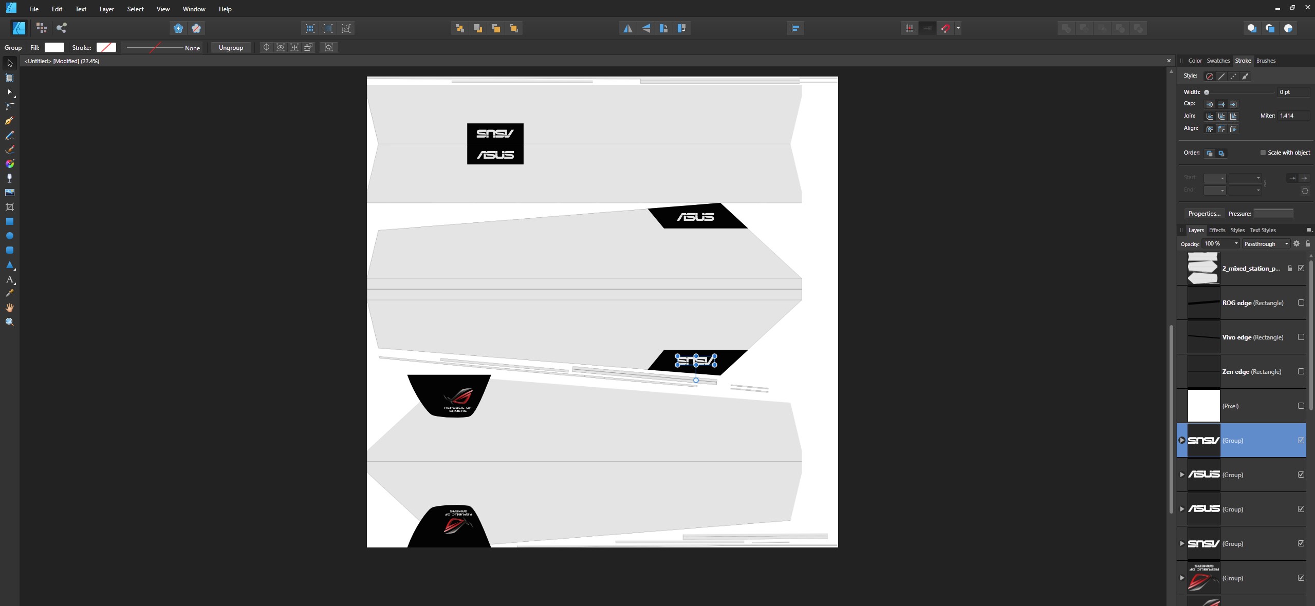 Parts of the model which required image-based texturing were UV unwrapped. Then, the texture layouts were made in Affinity Designer (an Illustrator alternative) and Photoshop.